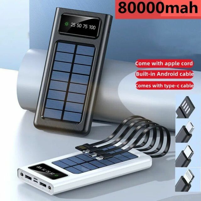 Step into the realm of infinite energy with our Ultra Capacity 80000mAh Solar Power Bank. Whether you’re exploring the great outdoors, traveling to remote locations, or simply need a reliable power source during emergencies, our solar charger is designed to keep you connected and powered up. With its solar panel technology and mammoth power storage, this device ensures that you are never left in the dark or without a lifeline to the digital world.